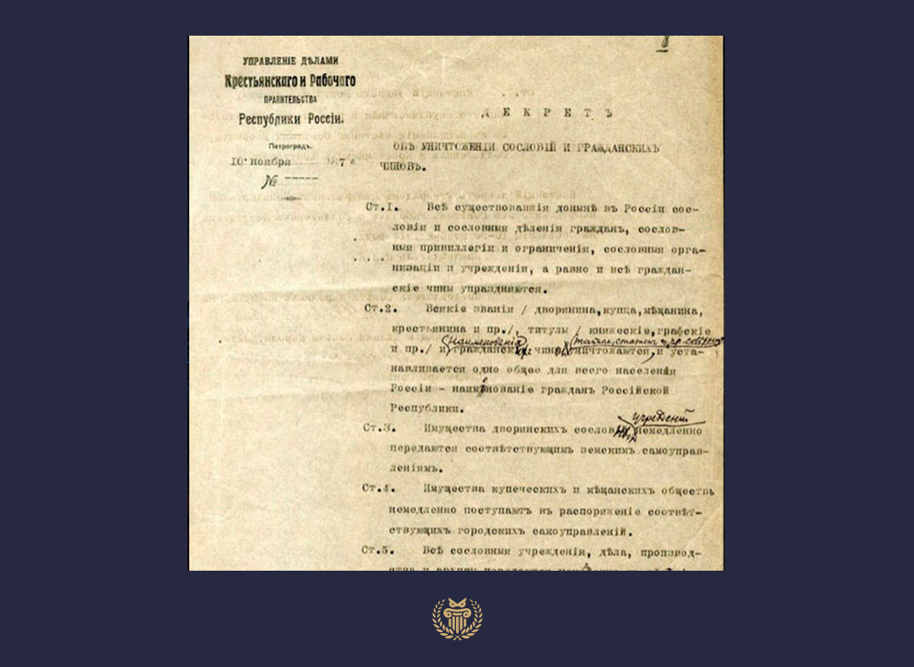 Всего через несколько недель после Октябрьской революции новый советский government — Совнарком — издал один из своих первых и самых судьбоносных декретов. Декрет «Об уничтожении сословий и гражданских чинов» стал настоящей социальной революцией на бумаге.